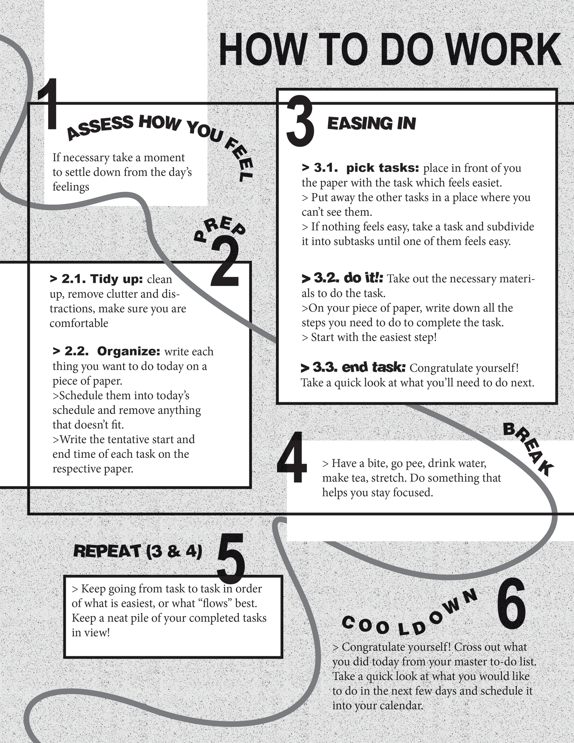 How To Do Work is a short zine detailing my Step-By-Step-By-Step technique to get things done while having ADD!